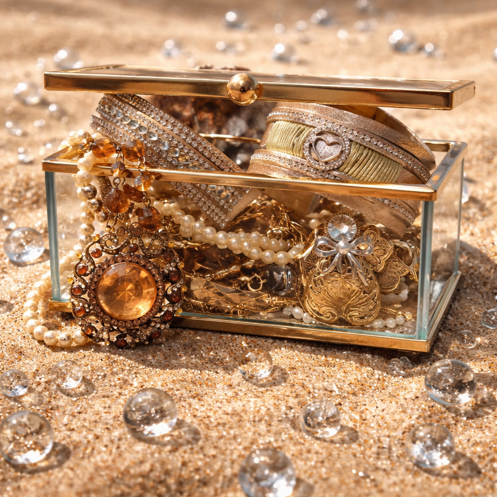 A stunning blend of elegance and display-worthy design, this square glass jewelry box is finished with sleek gold trim for a timeless, luxury feel. The clear glass panels beautifully showcase the treasures inside while keeping everything neatly organized and protected. Inside the bundle, youβll find coordinated gold-tone jewelry pieces designed to shine from every angle. Pieces are accented with a refined mix of sparkling rhinestones β¨, luminous pearl details π€, and warm amber tones π§‘